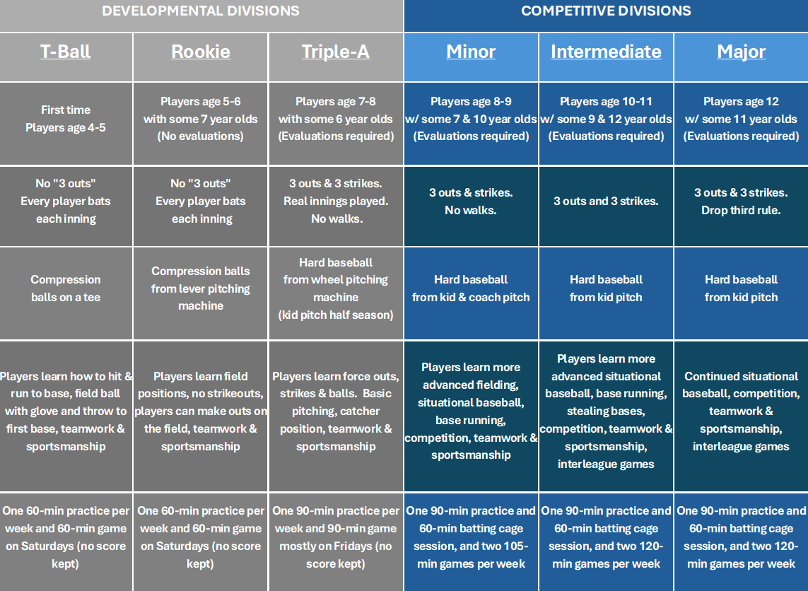 If you sign up for AAA, they will be placed in that division but must participate in Evaluations to ensure AAA is the proper division for them. If you sign up for Minor, they will participate in Evaluations, and then be assigned to a division, based on the league’s draft process.